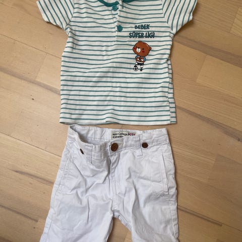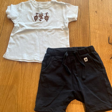 Lindex T-skjorte og shorts for barn i størrelse 80. T-skjorten er blå med print og laget av bomull. Shortsen er grønn og laget av bomull. Passer for både gutter og jenter.