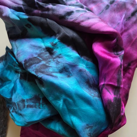 Vakkert silkeskjerf kjøpt i Kina. 100% silke. Svart front med broderier. For i oransje. Faller fint da foret og litt tungt silkestoff.