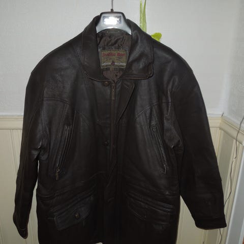 Brun skinnjakke for herre i størrelse M. Jakken er laget av skinnmateriale og har klassisk design og med solide knapper. ( den er en stor M nesten som L) (passer til vår&høst)