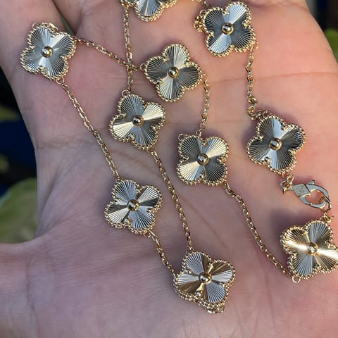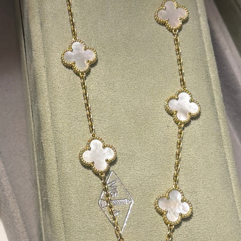 Kløverarmbånd. Nytt. Pris per stk. Datteren min er glad i kløversmykker. Hun fikk mange smykker til bursdagen sin. Se annonsene mine. Det er ett armbånd i butikken for 500 kr. Selges for halv pris.