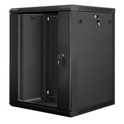 Serverrack i metall med glassdør, egnet for montering av IT-utstyr. Racket har perforerte sider for ventilasjon og en glassdør som gir oversikt over innholdet. Kan brukes i kontor- eller serverrommiljøer for organisering og sikring av elektronisk utstyr.