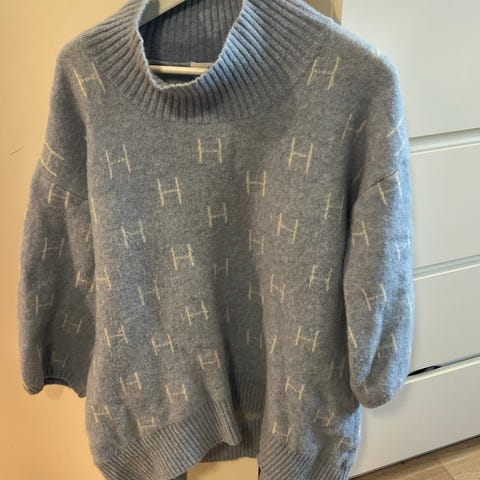 HÉST høyhalset genser i størrelse XL for kvinner. Genseren er beige og laget av alpakkaull. Den har et mønster med bokstaven H over hele plagget.
