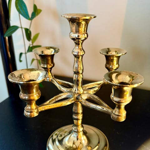 Design: Den har en klassisk Queen Anne-stil med en sentral stamme, to buede armer og en dekorativ base og lyskopper.