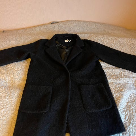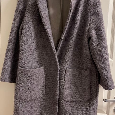 Ganni kåpe i størrelse M for kvinner. Jakken er laget av 48% ull og har en gråblå farge. Den har belte i livet og to frontlommer. Jakken er foret på innsiden, lyseblåt for. God og varm, ikke vært brukt på flere år.