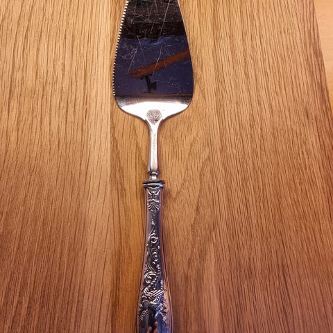 Souvenirskje med fajanseplate med håndmalt vindmølle på skaftet. Preget relieff av en mann med pipe i skjebladet. Stemplet Made in Holland. 11,8 cm. Usikkert om det er sølv eller annet metall. Selgews for kr. 150,- pluss porto.