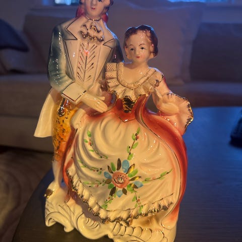 Figur i porselen som viser et par i historiske klær med detaljer i gullfarge.