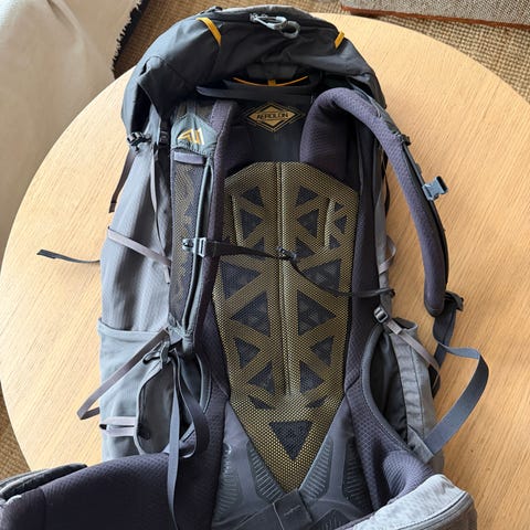 Osprey Exos 48 tursekk med 48 liters kapasitet. Sekken er svart og har pustende ryggpanel for komfort. Egnet for fotturer og lengre turer, med flere justerbare stropper og lommer for oppbevaring.