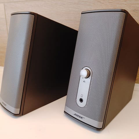 Bose høyttalersystem med tilkoblingskabler. Systemet består av en hovedhøyttaler med kontrollenhet og to mindre høyttalere. Designet for hjemmebruk med fokus på lydgjengivelse.