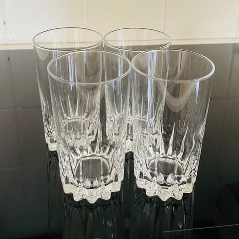7 vakre og strøkne vintage glass produsert i Italia. Fra Royal Crystal Rock (RCR). Modellen heter Alaska. Tung bunn og virkelig god kvalitet. Til vann eller whisky/drinks. 8,5 cm høye. 6,5 cm brede. Samlet pris..