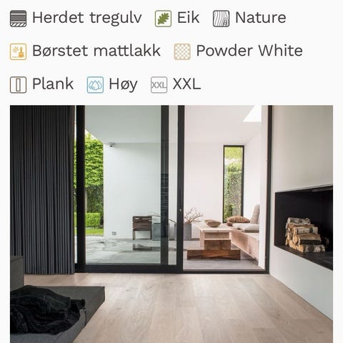 En uåpnet pakke (6 stk) og 4 hele lengder, totalt 10 lengder. Type: Kährs 15 mm matt lakk eik. Ca 5 m2.