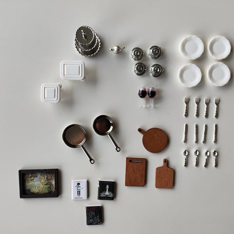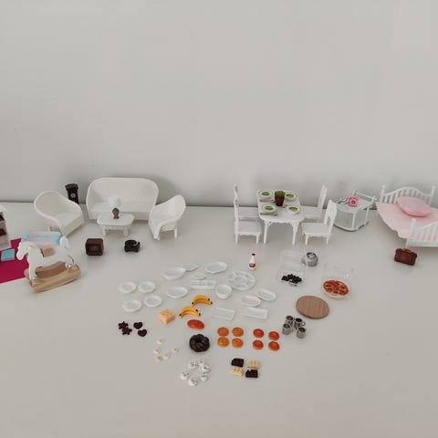 Nye møbler, mat og utstyr til Sylvanian families figurer eller små dukker.