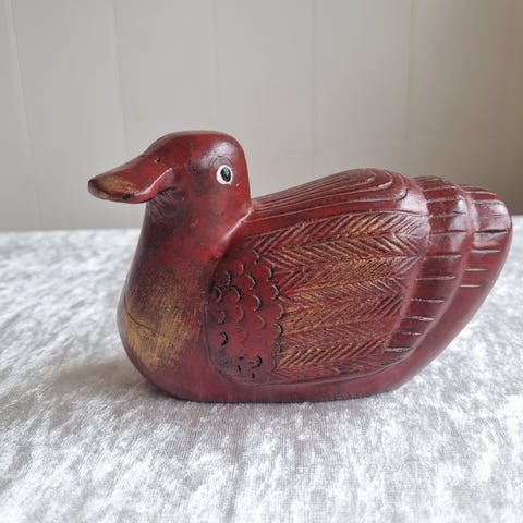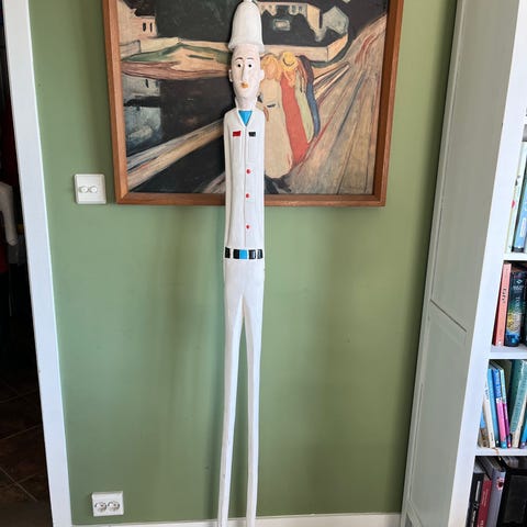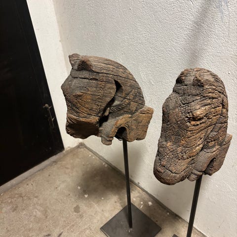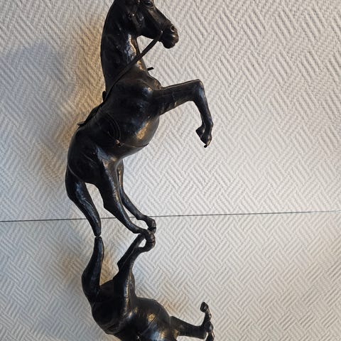 Selger to flotte og unike håndskårne trefigurer av liggende hester. Disse er store, solide og detaljerte – perfekte som interiørdekor, blikkfang i stue, gang, hytte eller butikk.