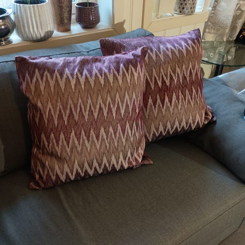 To pynteputer med grønt og svart blomstermønster. Putene har et dekorativt tekstilmønster som passer til ulike interiørstiler.