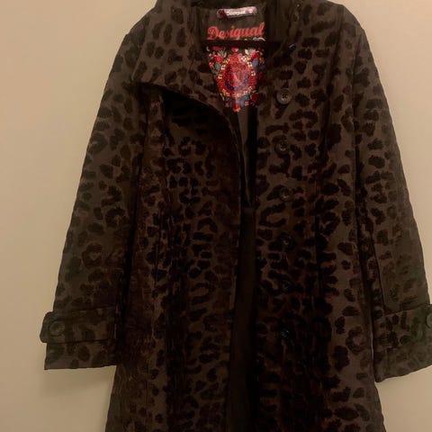 Jakke fra Desigual. Den et hvit og blåstrripet. Materialet er 55% lin og 45% viskose. Den har en rød blomst pyntet med oaljetter. Størrelse er L, men passer til damer i størrelse 38-40!
