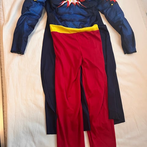 Kostymet er svart og rødt og består av: