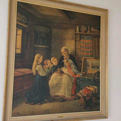 Eldre litografi etter Adolph Tidemand: «Bjørnejegernes hjemkomst» (kunsttrykk, ikke original).