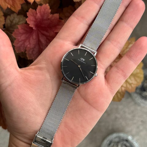 dameklokke med svart skinnrem og hvit urskive. Klokken har en rund urkasse med rosegullfarget detaljer og minimalistisk design.