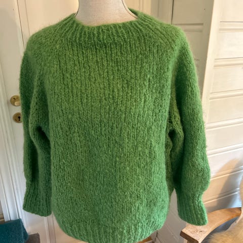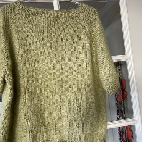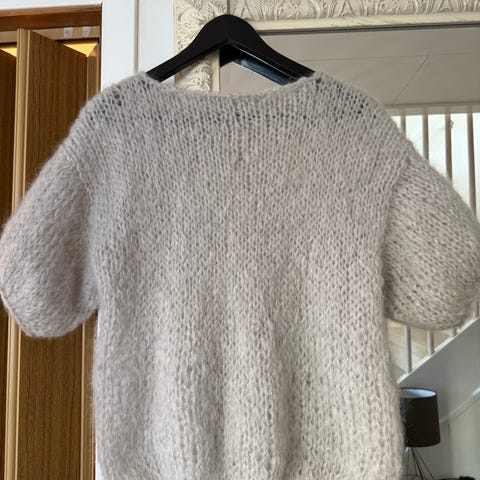 Helt nystrikkert genser/jumper kortermet. Strikket i Lotta fra Vikinggarn. 57% supervash merinoull og 43 % bomull. . Ingen dyr og røyk i hjemmet. Selges for kunn 400 kr