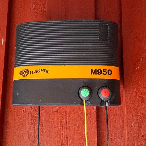 Delaval elektrisk gjerdeutstyr med ulike komponenter inkludert isolatorer, gjerdehåndtak, kabel og jordspyd.