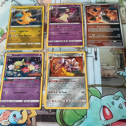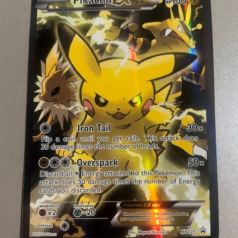 Pokémon samlekort, totalt 19 kort i settet. Kortene viser ulike Pokémon-figurer med varierende egenskaper og illustrasjoner.