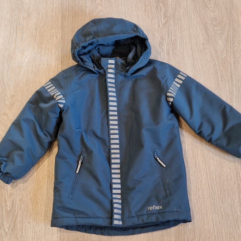 Reflex barnejakke i størrelse 116, blå farge, laget av polyester. Jakken er designet for unisex bruk og har hette samt refleksdetaljer for økt synlighet.