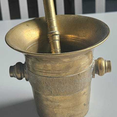 Messing morter med tilhørende støter. Egnet for knusing og maling av urter, krydder eller andre små ingredienser. Tradisjonelt kjøkkenredskap laget i messing.