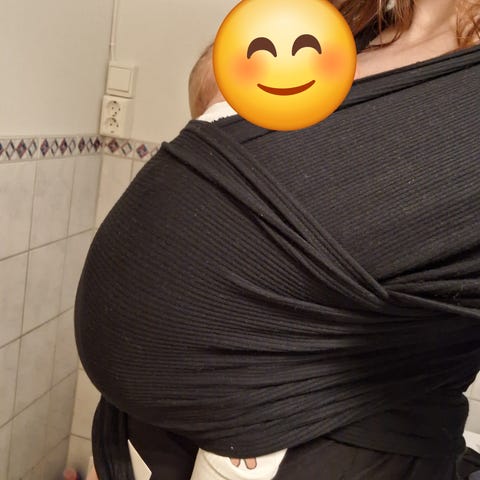 Fint bæresjal i praktisk farge. Vår minste trivdes meget godt der de første månedene.