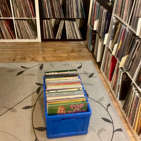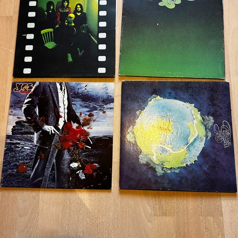 Samling av diverse vinylplater med musikk fra 1970/80-tallet, inkludert album fra artister og band som Genesis, Pink Floyd, A-ha, Meat Loaf, og andre. Platene dekker sjangere som rock og pop, med varierende coverdesign og farger.