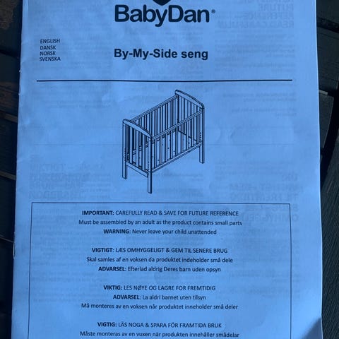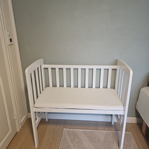 BabyDan Bedside crib. Seng designet for å plasseres ved siden av foreldreseng for enkel tilgang til barnet. Laget i hvit farge.