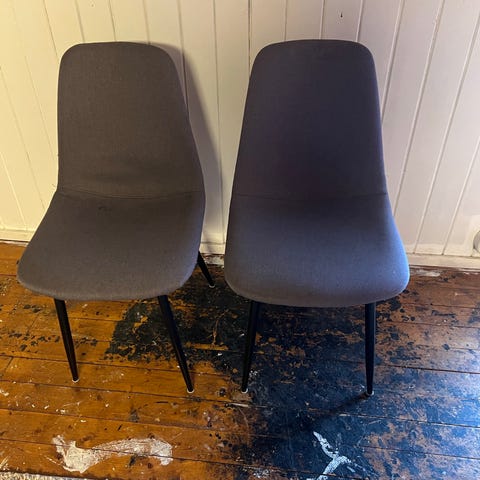 Kule spisestoler fra IKEA, 5 stk (har 6 stk men den siste har en sprekk i seg, kan brukes). Stolene har noe bruksmerker. Myke puter fra Jysk kan følge med for en liten ekstra sum (50 kr stk), da putene er kjøpt i desember-25
