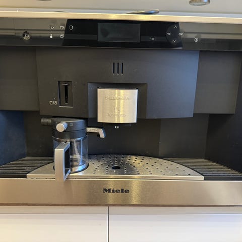 Miele innebygd kaffemaskin med rustfritt stål front. Maskinen har doble beholdere for kaffe og vann, samt et kontrollpanel med digital skjerm. Egnet for integrering i kjøkkeninnredning.
