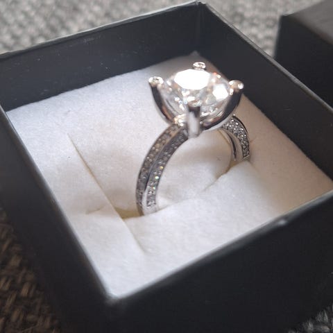1 ct Moissanite ring som er laget av S925 sølv og er justerbar i størrelsen. Moissanite steinen er 6,5mm, farge D, round brilliant og VVS1. Glansen er utrolig vakker og umulig å ta gode nok bilder. Det følger GRA med på kjøpet.