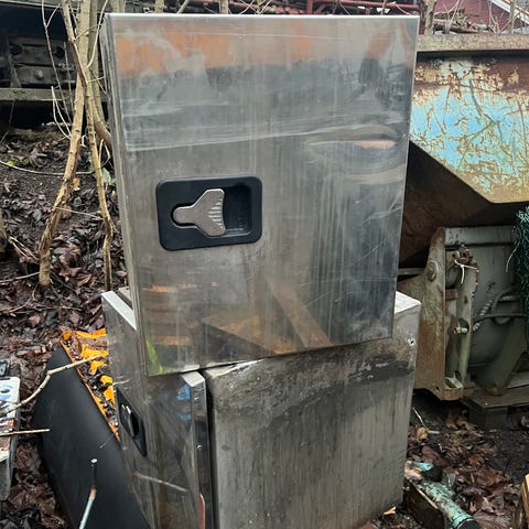 Stort rustfritt skap som er brukt som styreskap. Inneholder bl.a MG sikringer, Mitsubishi, Telemecanique motorvern og brytere, rekkeklemmer, frekvensomformere. Ikke satt spenning på skapet så vet ikke om alle komponentene virker, men virket før skapet ble koblet fra.