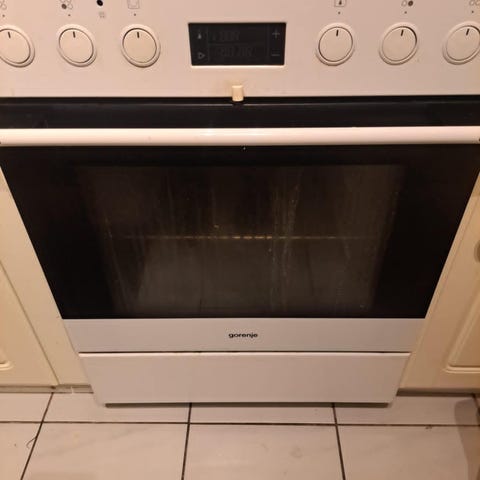 Gorenje keramisk komfyr med keramisk kokeplate. Komfyren har flere betjeningsknapper for varmeinnstillinger og en ovnsdør med glasspanel. Fargen er hvit, og den er egnet for bruk i kjøkkenmiljø.
