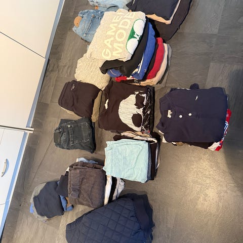 En hel haug med bukser, gensere, tskjorter, skjorter, shorts. Ingen hull eller flekker som jeg har sett.