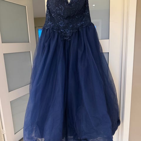 Blå selskapskjole kjøpt i USA. Simpel og fin, henger etter kroppsfasong. Den er ikke mørkeblå, se de andre bildene for å se fargen ordentlig.