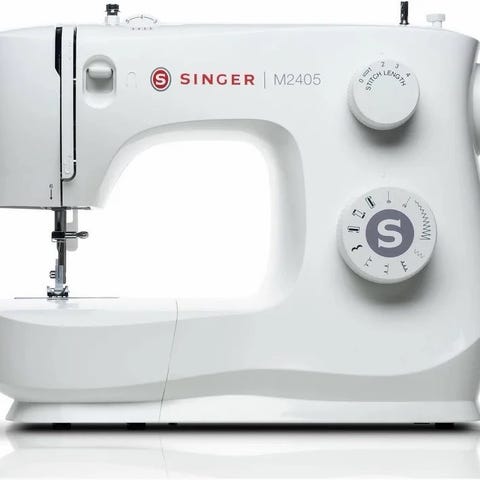 Husqvarna Viking 950 symaskin med flere sømvalg. Maskinen er hvit med svart håndtak og har medfølgende syfotssett. Bruksanvisning følger med.