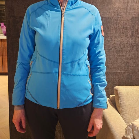 Wool Land jakke i blå og hvit farge. Jakken har glidelås foran, to lommer med glidelås og høy krage. Avtagbar hette. Materialet er mykt, varmt og vindtett, egnet for langrenn/utendørsaktiviteter.