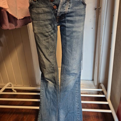 Nudie Jeans herrejeans i svart farge, laget av denim materiale. Lengde 34 og midjemål W34, tilsvarer ca L.