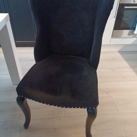 Sittegruppe i heltre med mørk brun beis. Litt gullfarge i utskjæringer, på benken. Bordplaten er ikke malt eller beiset. Benken har en sitte dybde på 47cm. Oppbevaring i hele benkens bredde og høyde. 5 stk stoler følger med. Bordplaten er tykk, og veier mye. Bør være minst to til å bære. Selges samlet