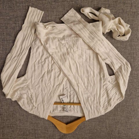 Hvit/beige, kortarmet, ribbet, bolero/cardigan, omslagstopp med lange knytebånd. 50% økologisk bomull, 50% tencel.