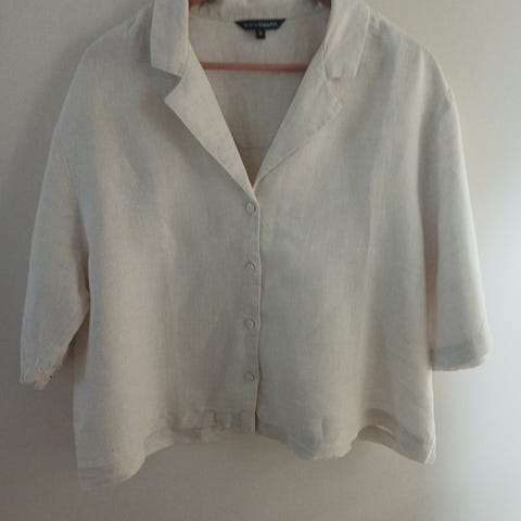 Kortermet topp , Barbra shirt, fra Zavanna i behagelig, stretchy stoff (90 % polyester og 10 % viscose). Naturhvit/beige, fin struktur i stoffet, str M. Lappen har falt av, men toppen er ubrukt.