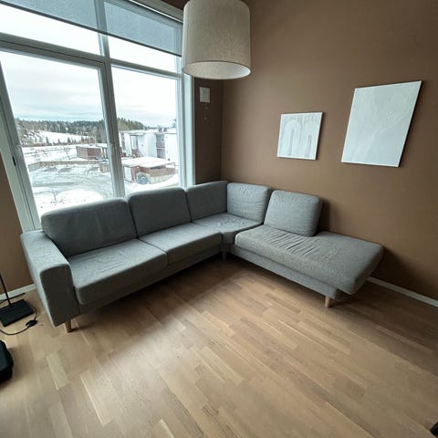 Selger en pent brukt tre-seters hjørnesofa med sjeselong grunnet flytting.