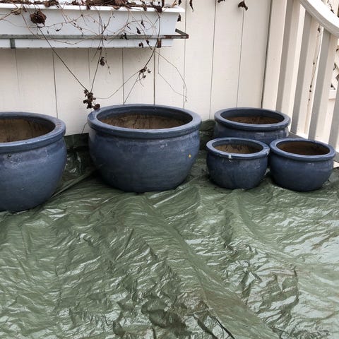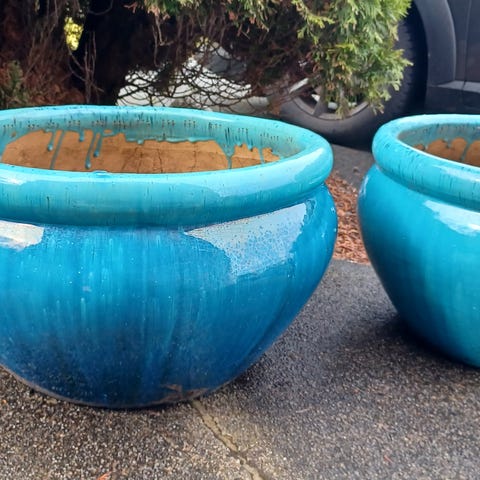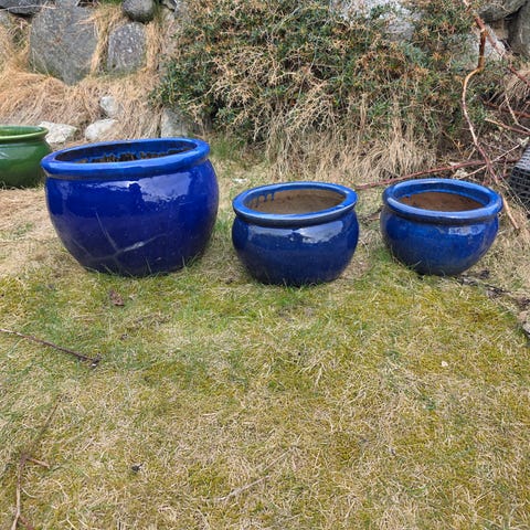 Pottene er hele (litt dårlige bilder da de ikke er vasket og noen står litt gjemt) Pottene har en rund form og en glassert overflate som gir den et skinnende utseende. Passer til større planter eller små trær.