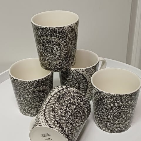 Arabia Paul Ray krus med svart-hvitt tegnet design. Keramisk materiale. Passer til bruk som drikkekopp.