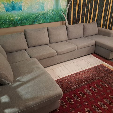 Selger en pen U sofa, denne er veldig stor, plass til mange å helt fantastisk å sitte i, den er ikke så dyp at du MÅ ligge i den for ryggstøtte sånn som på Boston sofa, denne er mere behagelig å sitte vanlig i.