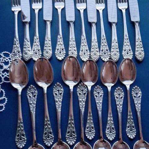 Gaffel i bestikk med dekorativt mønster på skaftet. Laget i metall med detaljerte utskjæringer. Passer til bruk ved måltider.