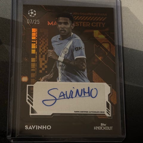 Julián Álvarez signert gullkort fra Topps Manchester City Team Set 2023/24. Nummerert 33/50 og gradert SGC 9.0. Topps-sertifisert autograf. Kortet leveres i original SGC-slab og er i meget god stand. Attraktivt samlekort av verdensmester og Manchester City-spiller.