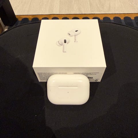 Apple AirPods Pro gen 2 trådløse hodetelefoner i hvit farge. Kommer med ladeetui og støykansellering. Designet for trådløs bruk med kompatibilitet for Apple-enheter.