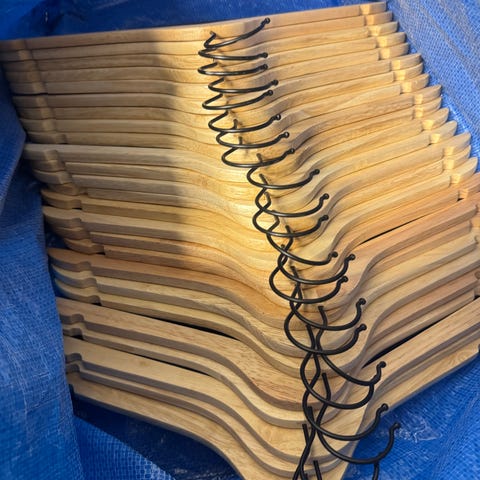 Sett med kleshengere laget av naturfarget tre, hver 30 cm lang. Hengeren har en metallkrok som kan roteres 360 grader, samt metallklyper for feste av klær. Egnet for oppheng av bukser, skjørt eller andre plagg som krever klypefeste.